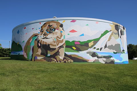 Along a well-travelled stretch of Winston-Salem’s Peters Creek Parkway, local motorists and visitors can’t miss the colourful, 50-foot-tall otter. Stretching 290 feet across the ground-level water tank, the artwork is a nod to both the local water supply and the North American River Otter that is indigenous to the Yadkin River.
